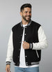 Step up your casual game with a jacket that embodies sporty heritage. This Letterman-style jacket is expertly crafted with a heavy-duty black felt or wool-blend body and eye-catching white faux-leather sleeves for a distinctive texture and high-contrast appeal. Every detail counts, from the classic white-on-black striped ribbing on the collar, cuffs, and hem to the polished snap-button front closure. Whether you're aiming for a retro aesthetic or a contemporary street look, this jacket is the perfect piece to give your outfit that athletic, confident finish. Side pockets keep your hands warm and essentials secure.